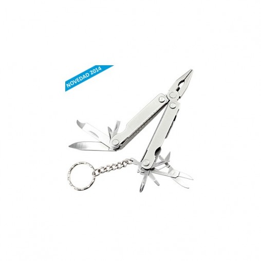 Multiherramienta metálica plegable de 10 funciones, con llavero. Incluye mini-regla en cm. y pulgadas. Presentación en estuche de polyester negro y caja plateada de regalo.
