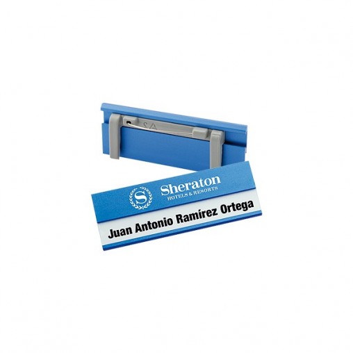 Identificador de Aluminio "Bindel", con ventana para insertar nombre-cargo-empresa. Incluye clip posterior para colgar en el bolsillo y alfiler de gancho para enganchar en cualquier prenda.