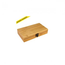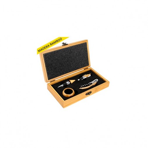 Deluxe Set de 4 accesorios para el vino, en caja 100% madera Bamboo, con cierre mosquetón envejecido.