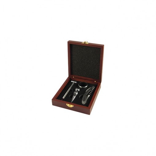 Set de 4 accesorios metálicos de vino en caja de madera barnizada.