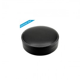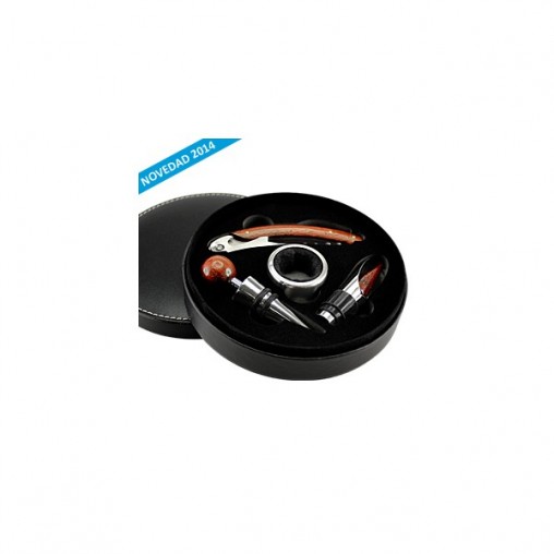 Set de 4 accesorios metálicos para el vino, con terminales de madera barnizada, presentación en estuche redondo de PU negro con tapa.